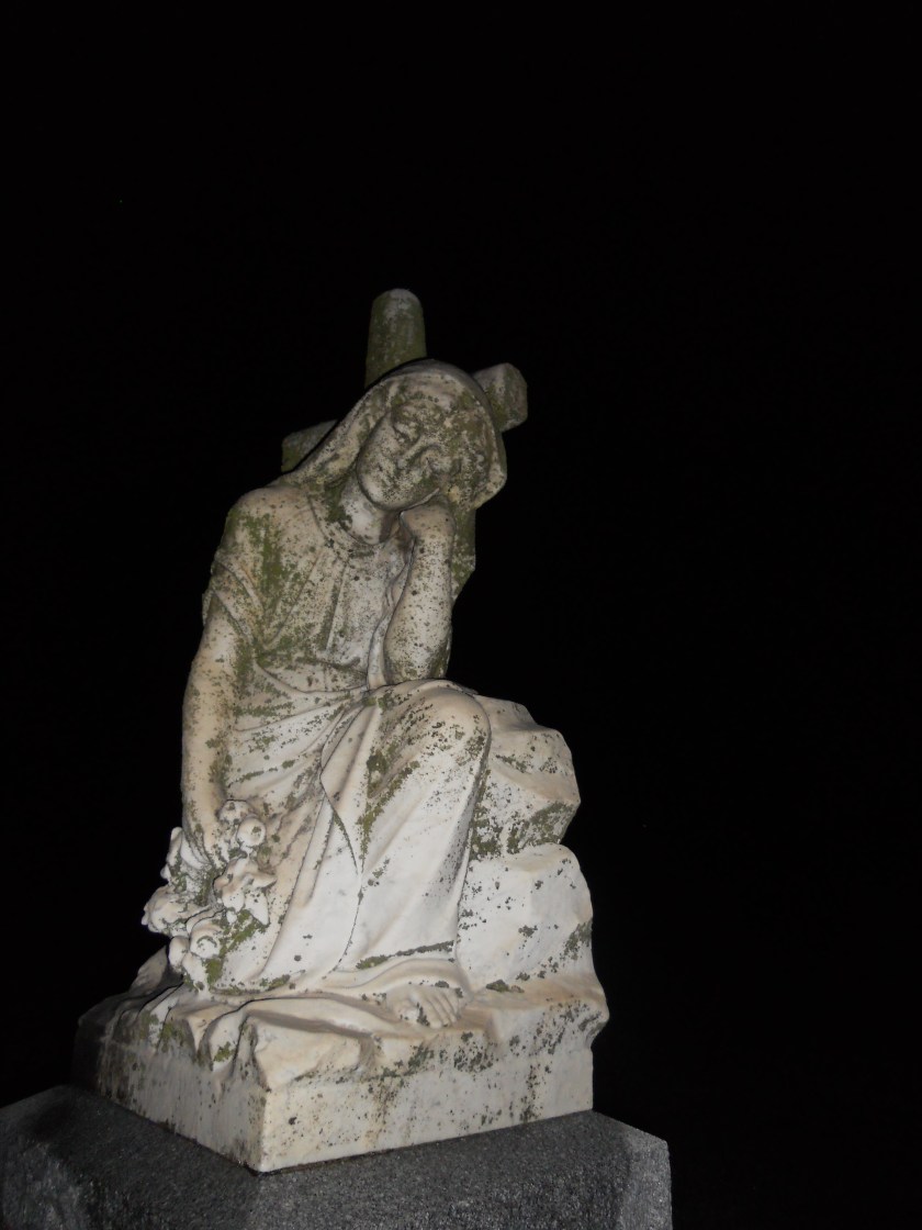 The best part about the storm was the calm that followed. Being with friends with flashlights and having nothing to do but explore brings out those boyish instincts to hike and climb and pry. There was even a cemetery with the side gate half-open, just asking us to enter and look around. We were attracted to the biggest, highest statue in the graveyard and the saddest-looking ones.