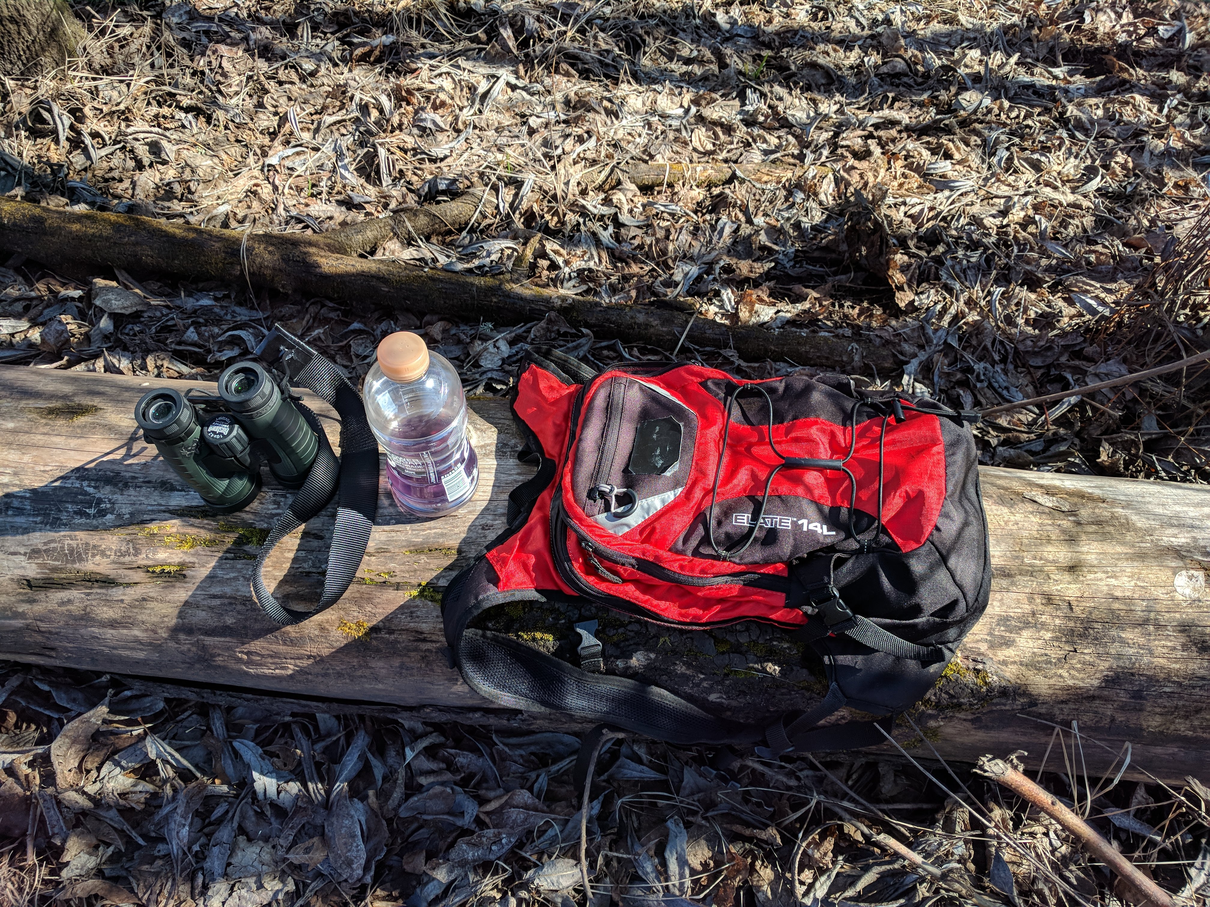 I took a photo of my binoculars, backpack and grape Gatorade because they struck me as so familiar. I will always be happy with a few simple things: a nature trail, a pair of binoculars and a backpack with various contingencies such as mixed nuts and water.