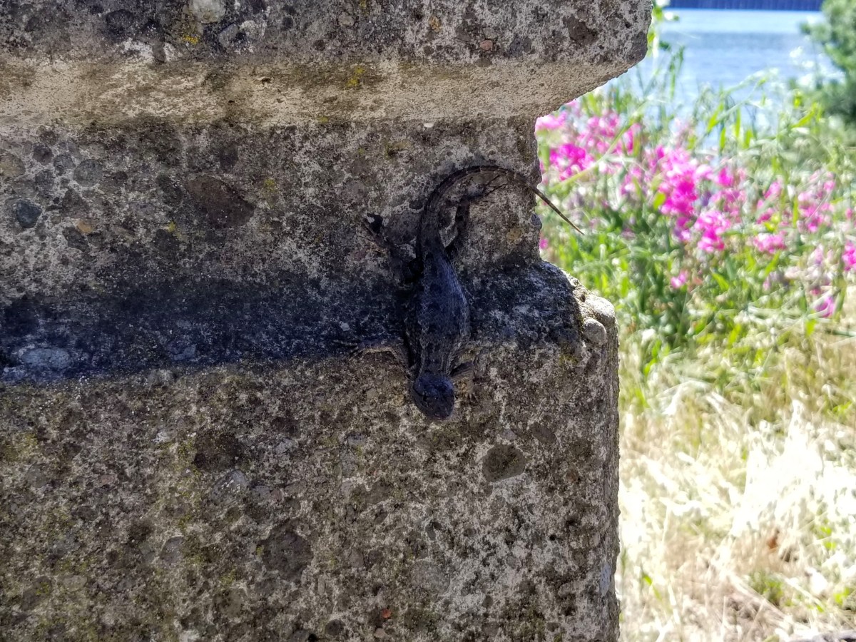 These little lizards fascinate me. Western fence lizards are common along the Willamette River in dry rocky and sandy areas, including on sidewalks. They creep about in an upright stance pretty boldly. They seem to think they are hidden, even when you photograph them from a couple of feet away.