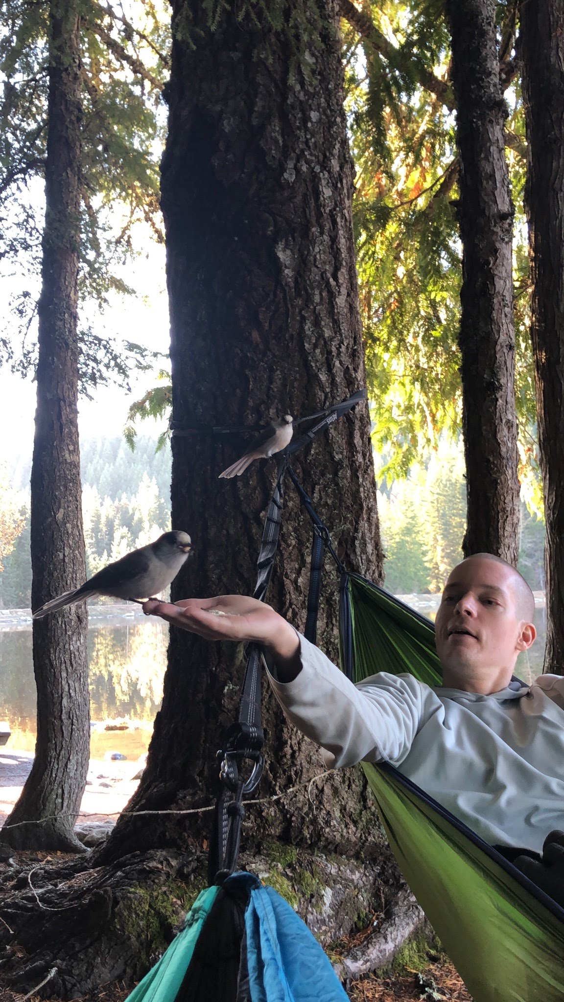 We walked with a three-month old puppy and habituated her to her cargo harness. We fed the clever, curious gray jays that ate right out of our hands. A Steller’s jay accompanied the group of gray jays but kept its distance from us.