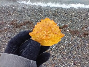 It is a colorful crab carapace fragment from Alki Beach.