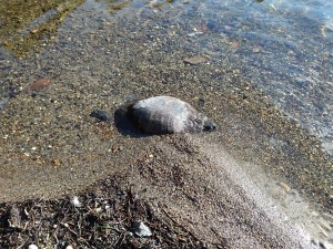 I found what I think was a western pond turtle half-submerged in the sand. I think it was getting oxygen and sun on a recent sunny (but still pretty cold) day before burrowing back under. Just its nose protruded. And its back was dry.