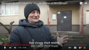 She said her husband was missing for a couple of days. She searched. She went to a humanitarian facility and they pointed to two bodies. As she neared, she recognized his clothes. The body was that of her husband. He had been tortured and killed by Russian troops as they retreated. She said his face was mutilated and his body was cold.