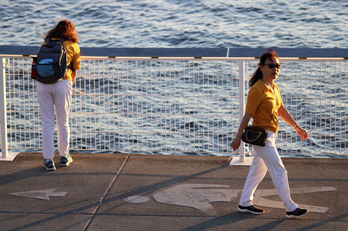 Two women with the same outfit on the Seattle waterfront in Fall 2022.