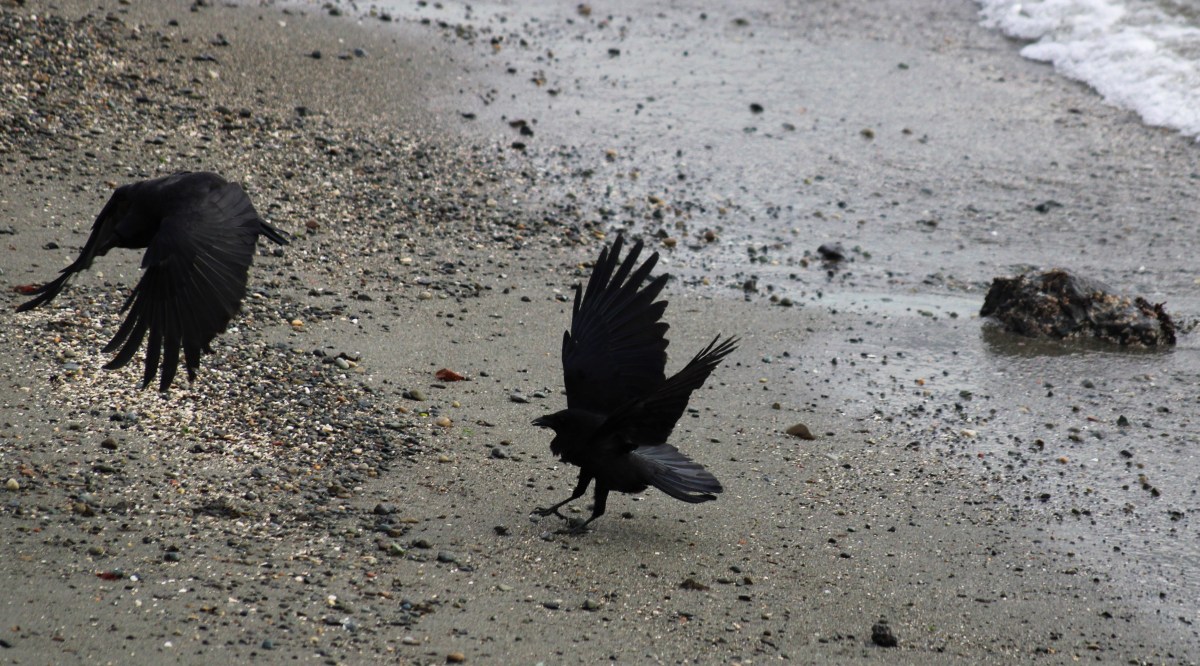 Crows squabble, squawk, and play on a beach on Puget Sound in March 2023.