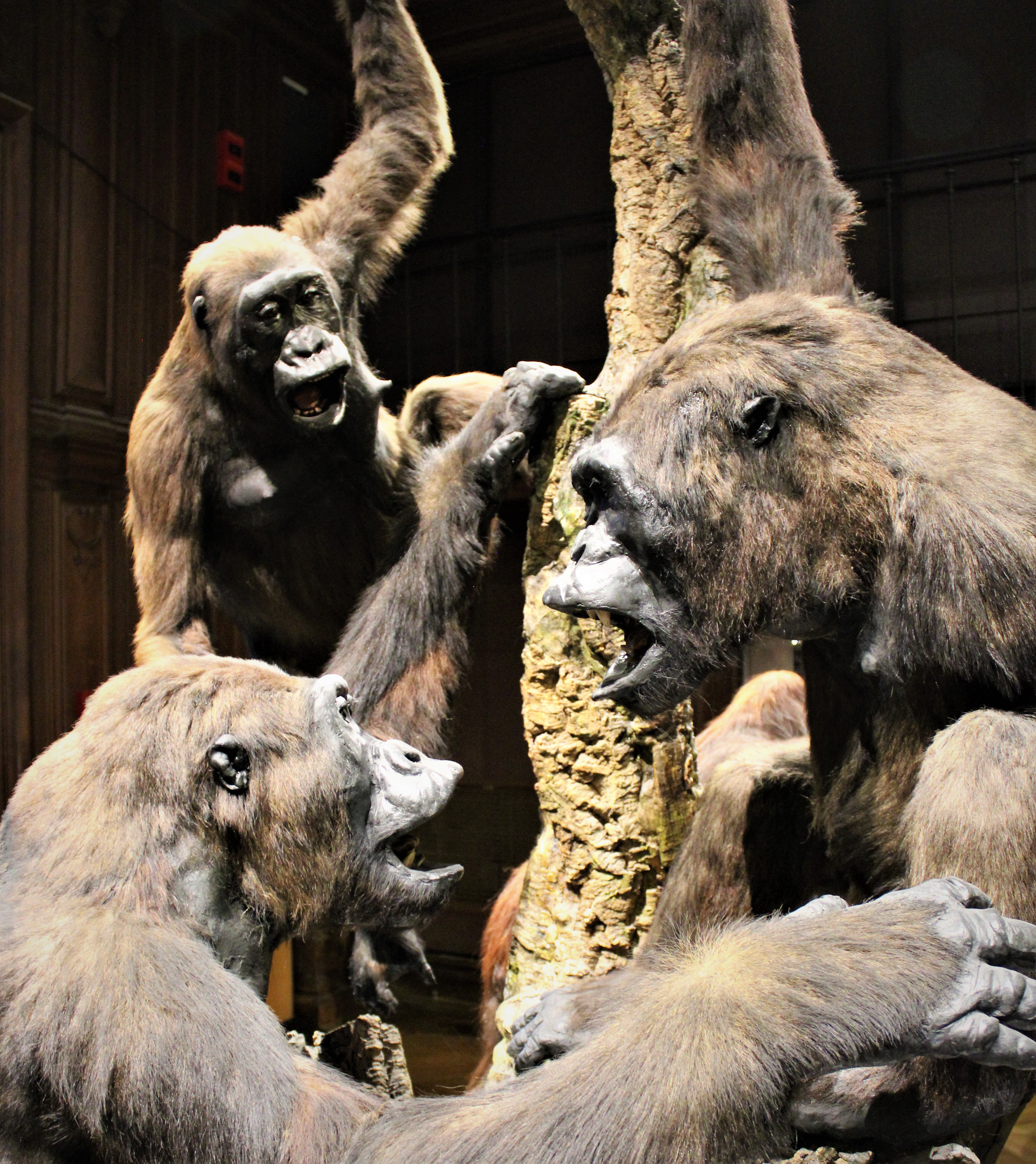 Three apes (I think they are bonobos) pant, hoot and gesture at the Grande galerie de l’evolution.