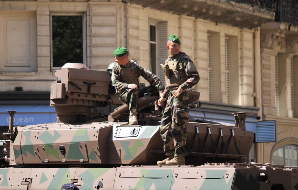 Deux soldats français qui attendent patiemment après le défilé des troupes motorisées au jour de la fête nationale.