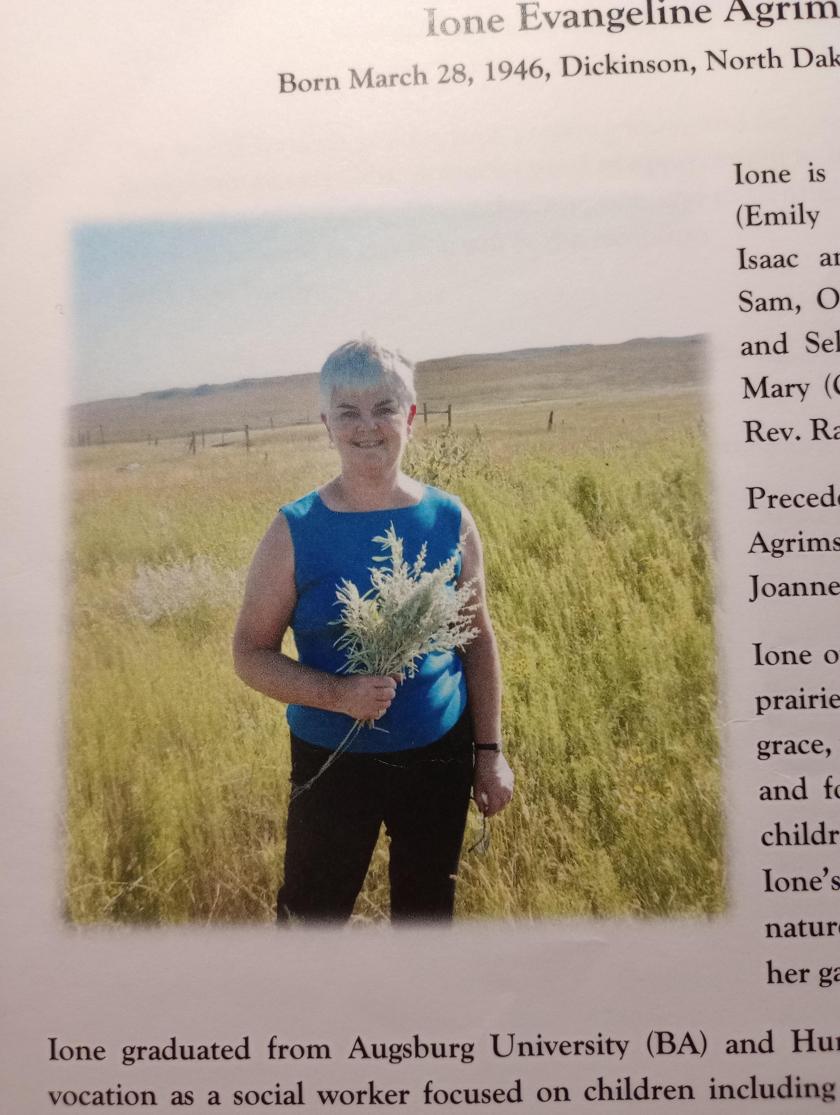 My mom’s life is now in the past. The future holds a burial of her ashes, which are now in a hallowed corner of my dad’s living room, surrounded by sweetly glowing purple, Ione’s favorite color. As a family, we are planning a road trip to the prairies of North Dakota that she so loved. My mom had a deep recognition of herself as a woman of the Dakota prairies. We will scatter a few of her ashes there, among the pale green sage. She used to break the leaves of the prairie sage for me to bring out its evocative scent.